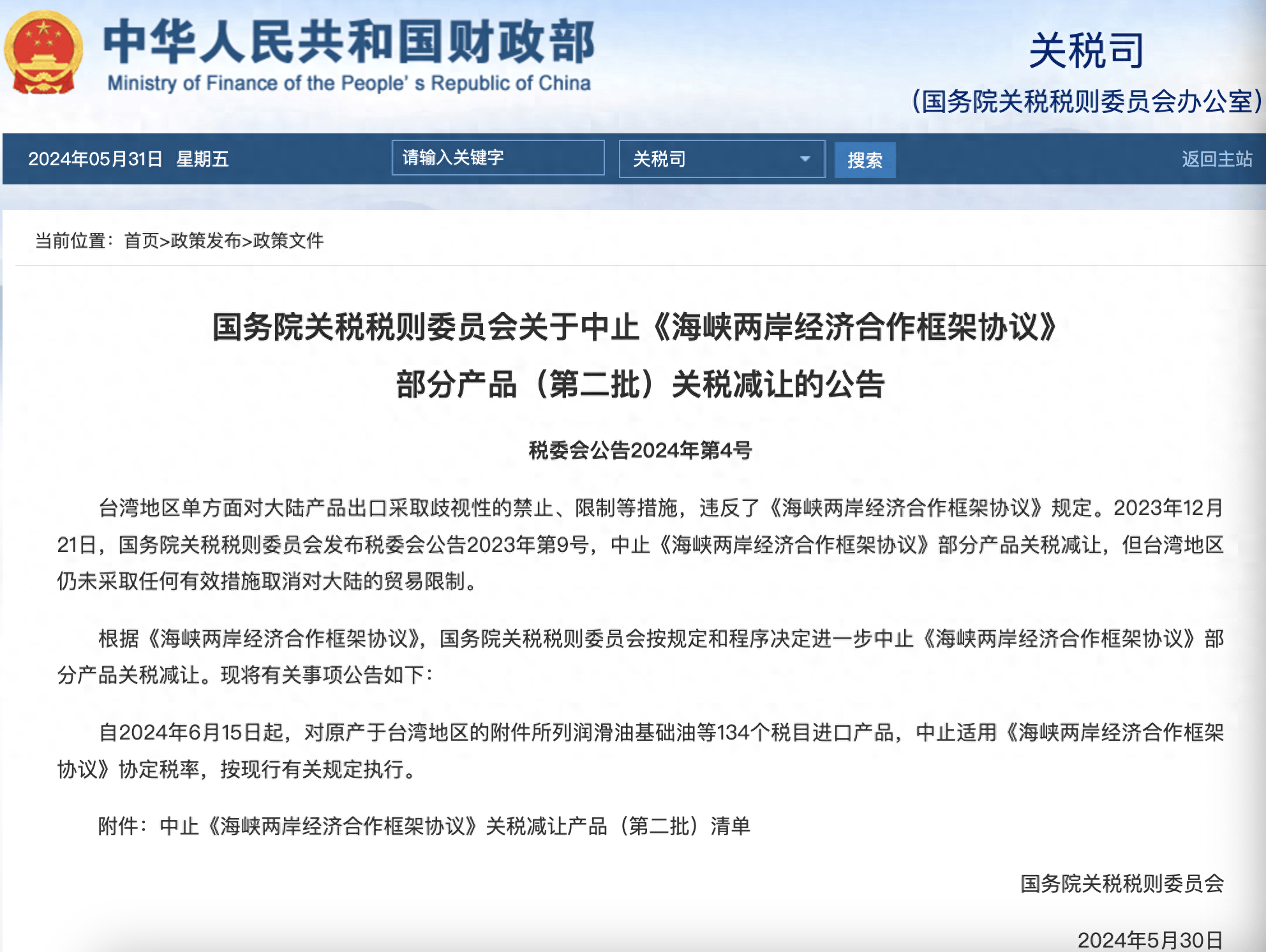 日前,国务院关税税则委员会发布公告:台湾地区单方面对大陆产品出口采取歧视性的禁止、限制等措施,违反了《海峡两岸经济合作框架协议》规定。2023年12月21日,国务院关税税则委员会发布税委会公告2023年第9号,中止《海峡两岸经济合作框架协议》部分产品关税减让,但台湾地区仍未采取任何有效措施取消对大陆的贸易限制。
